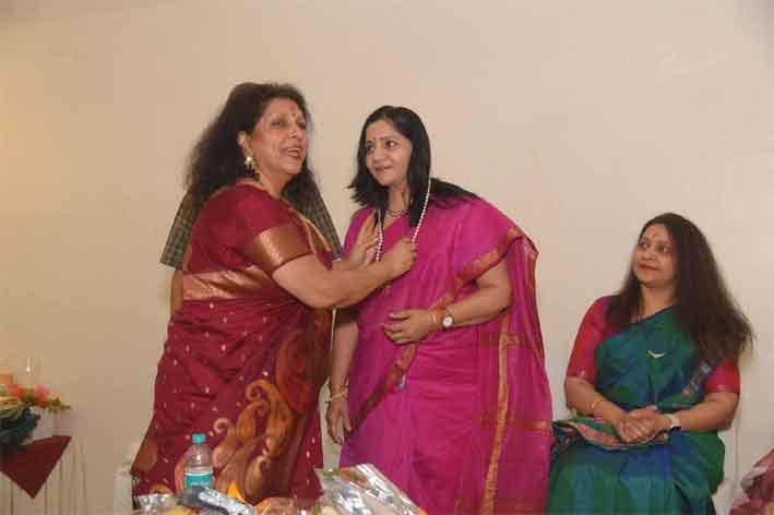 हल्दी कुमकुम लगाकर,इत्र अर्पित कर स्वागत किया गया। मुख्य द्वार पर आकर्षक रंगोली बनाई गई थी। अतिथियों का स्वागत करने के लिए आयोजन समिति की सदस्याएँ महाराष्ट्रीयन पारम्परिक वेशभूषा में थीं।
